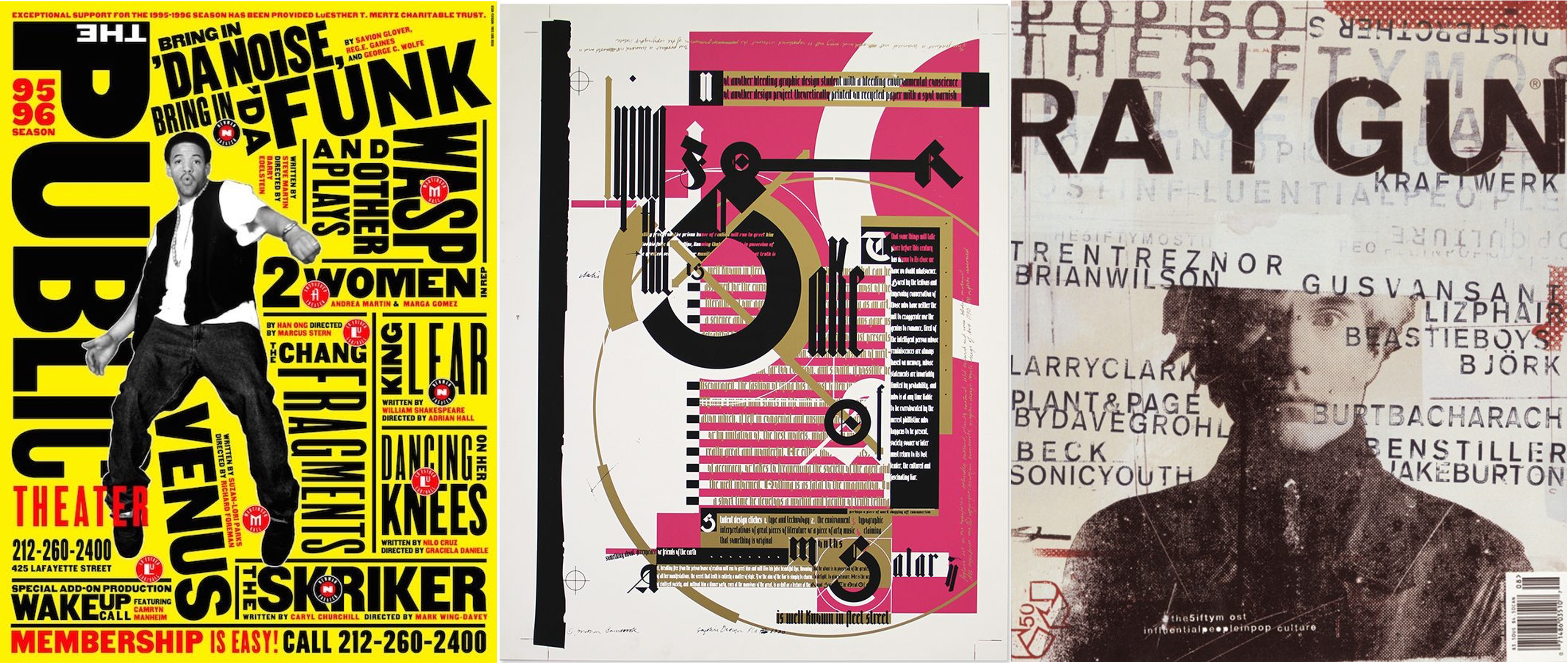 Paula Scher (left); Jonathan Barnbrook (middle); David Carson (right) |